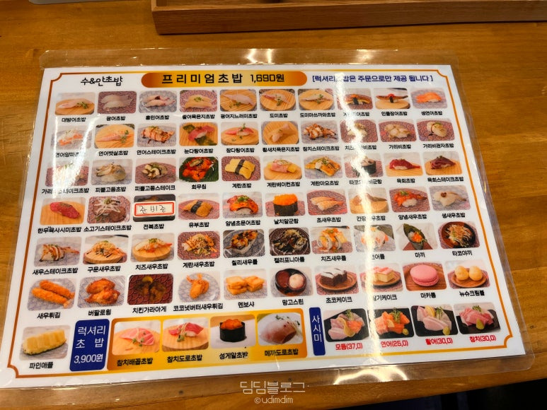 프리미엄 (1,690원): 대방어, 광어, 불미새우, 광어문어, 광어지느러미, 연어, 연어갈릭, 연어양파, 눈다랑어, 도미/방어, 한니굴양, 생연어, 대하, 타코, 한치, 광어활어, 가리비, 가리비갈릭, 함유육, 훈연연어, 에이스새우, 한치스테이크, 가리비, 파이어, 파이어갈릭, 파이어스테이크, 회무침, 계란, 계란구운, 참치, 육회, 육회스테이크, 함우육사시미, 소고기스테이크, 고등어, 전복, 유부, 양념, 생새우, 새우스테이크, 구운새우, 치즈새우, 계란새우, 비프포크, 치킨가라아게, 코코넛타다새우, 멘쯔. 럭셔리 (3,900원): 파인애플, 참치배꼽살, 참치도토로. 사시미: 모둠(37조각), 연어(25조각), 활어(30조각), 참치(30조각). 디저트: 망고스틱, 초코케이크, 딸기케이크, 마카롱, 뉴욕크림볼.