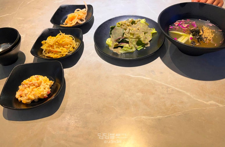 샐러드 시원한 묵사발 국물 이 나왔어요