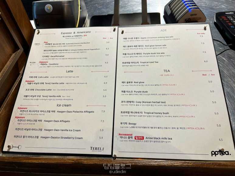 에티오피아 카욘 마운틴 네추럴 구지 G1 5.0, 코스타리카 리오 그란데 무산소 6.5, 디카페인 5.0, 까발로노 4.5, 카페 라떼 6.0, 테를지 바닐라 라떼 6.9, 초코 라떼 5.5, 테를지 바닐라 우유 5.0, 하겐다즈 아이스크림 커피 7.5, 하겐다즈 바닐라 아이스크림 5.9, 하겐다즈 딸기 아이스크림 5.9, 애플 시나몬 우롱티 에이드 7.5, 레드 글로우 레몬 에이드 7.5, 퍼플 더스크 티 에이드 7.5, 트로피칼 아이스티 6.0, 레드 글로우 5.0, 퍼플 더스크 5.0, 코지 한방차 5.0, 트로피칼 허니부시 5.0, 부기 5.0, 아니스 블랙 밀크티 6.5.