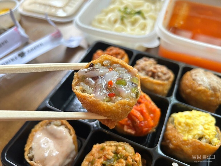 저는 한입유부 - 모둠유부랑 김치어묵우동을 주문했어요