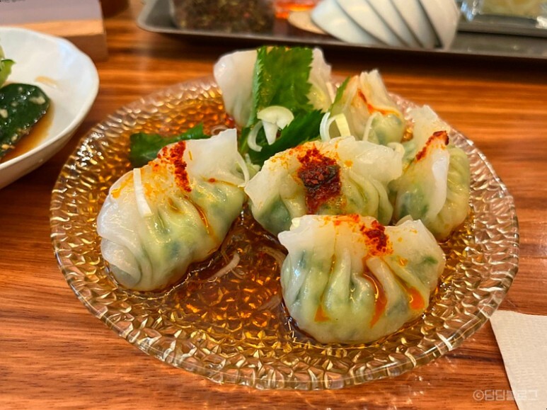 만두 위에 고츄기름이 올라가있는