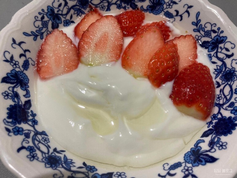 집에 남아있는 요거트와 함께 딸기를 썰어서 먹어봤습니다