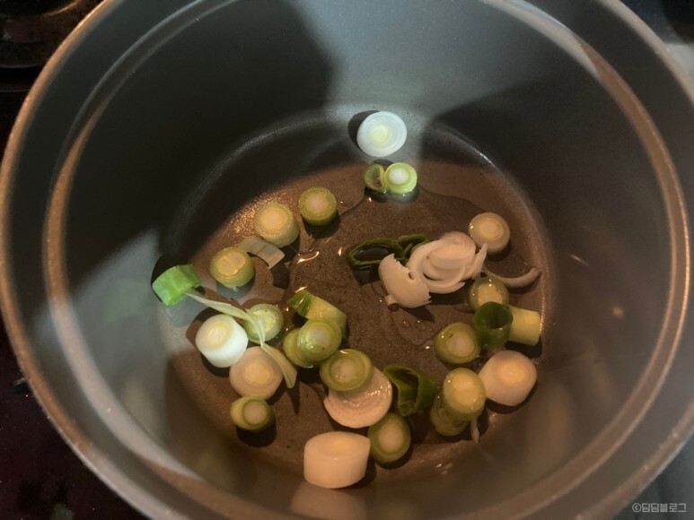 1. 기름에 대파랑 다진마늘을 볶아요