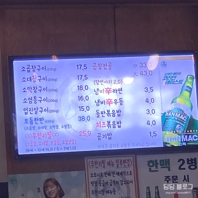아 그리고 막창이 수급이 안 되어서 업진살로 바뀌었다고 해요